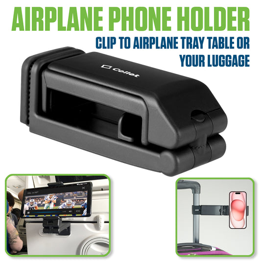 PHAP01 - Cellet Airplane Phone Holder Mount – Foldable Travel Phone Clip for Airplane Tray Table or Luggage Handle, Adjustable 360° Rotation, Universal Fit for iPhone, Samsung, Google Pixel & More
