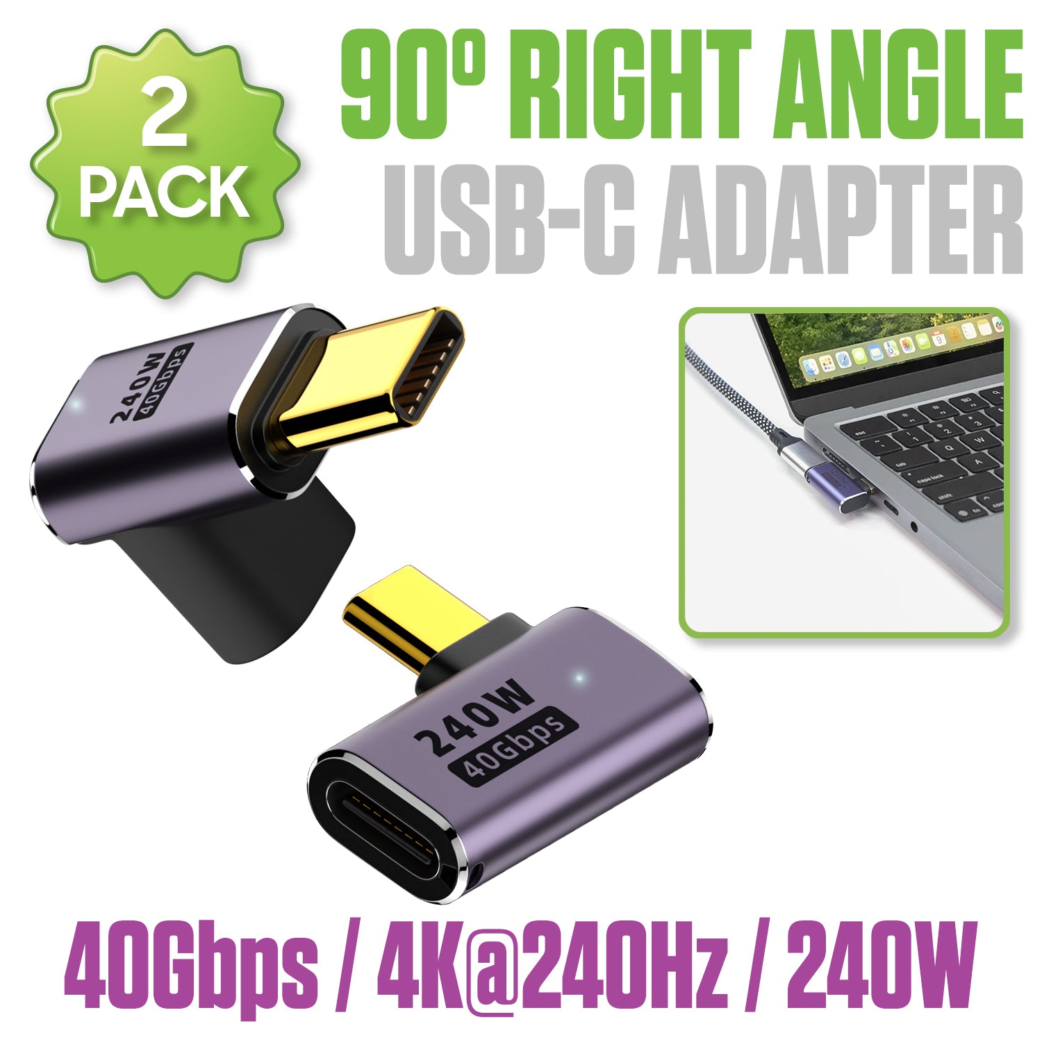 DCCADT - Cellet 90° Right Angle USB-C Adapter (2-Pack), 240W PD Fast Charging, 40Gbps Data Transfer, 4K@240Hz Video Output, USB4/Thunderbolt 3 & 4 Compatible, USB-C Male to Female Connector