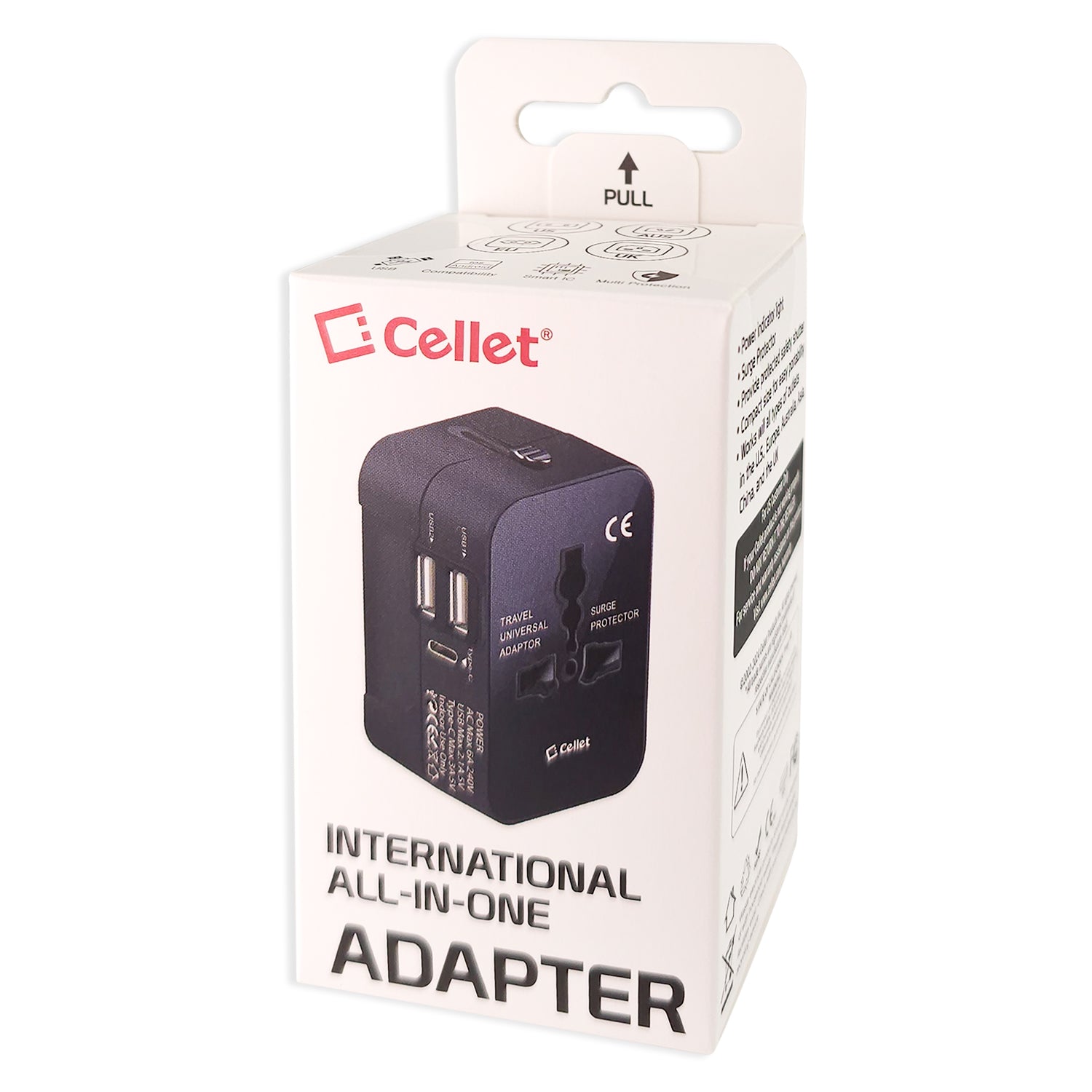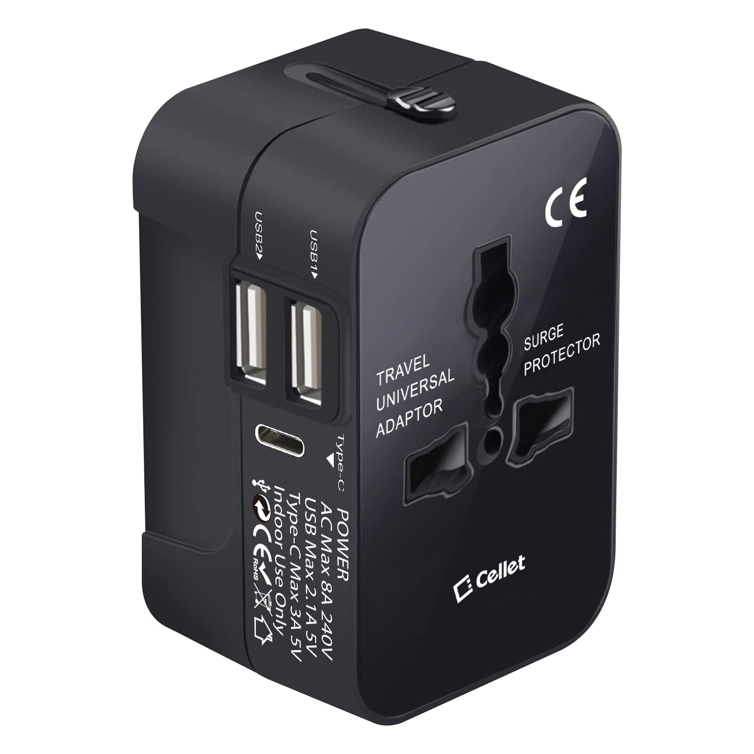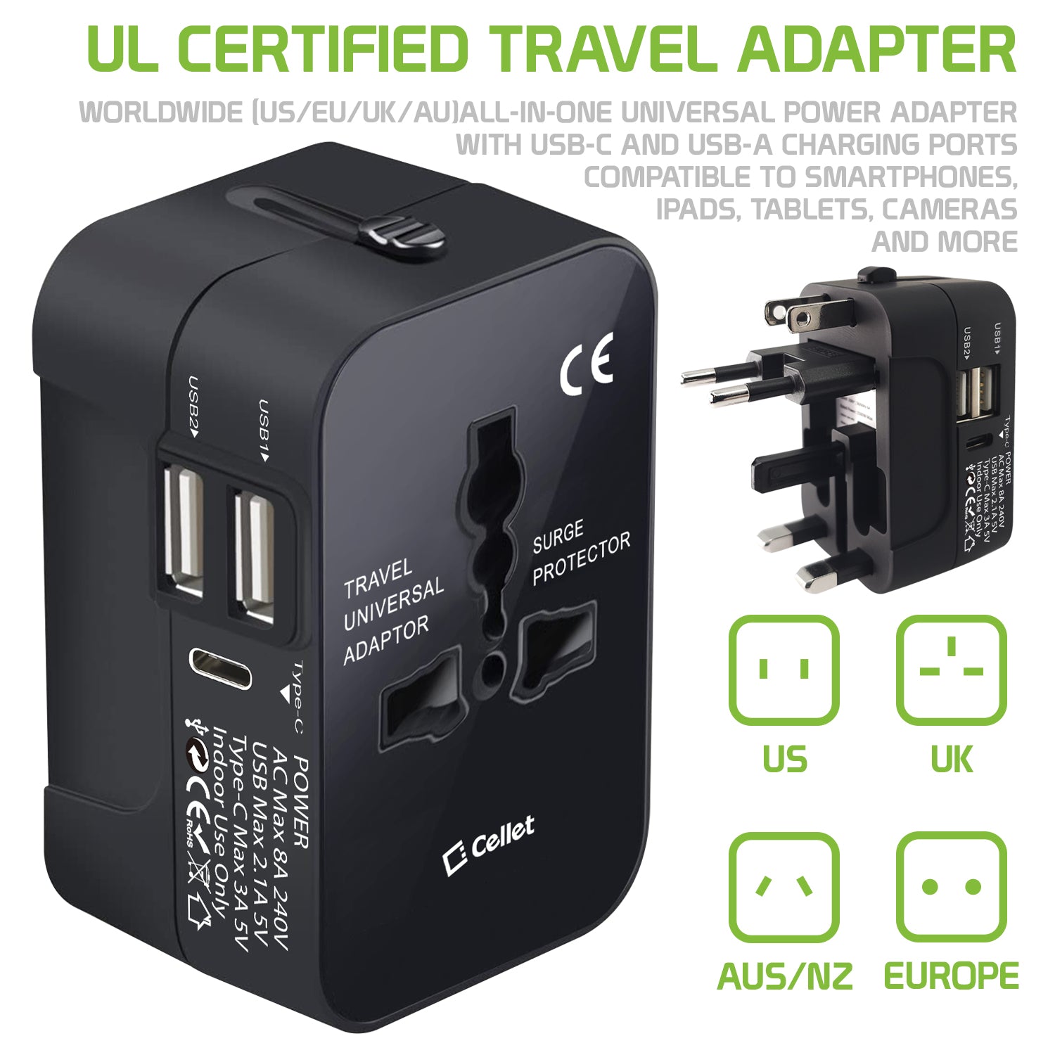 CNUNMC - Cellet International Travel Adapter, All-in-One Worldwide Power Adapter with USB-C & USB-A – Cellet Universal Plug for US/EU/UK/AU – Surge Protection, UL Certified, for Phones, Laptops, Tablets, Cameras