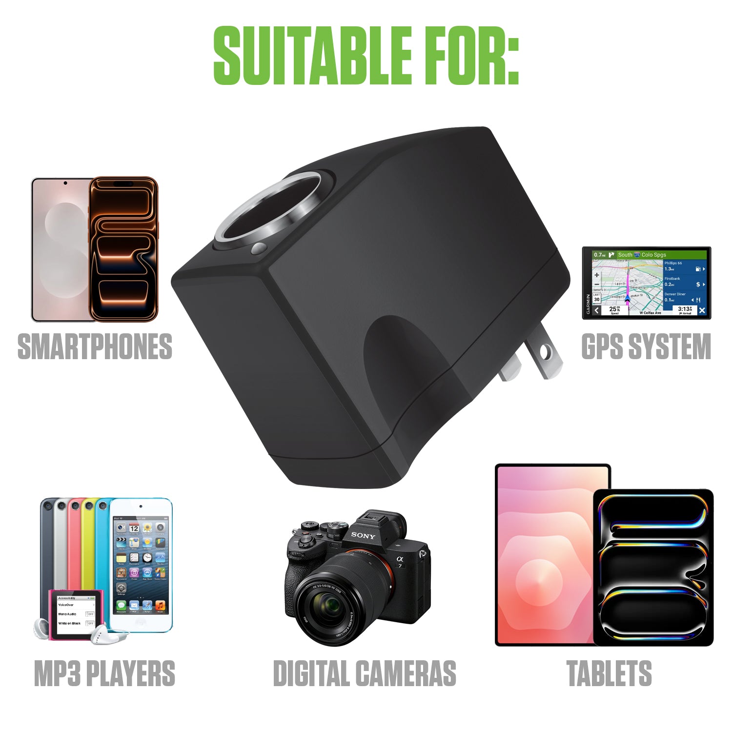 - 🔌 Universal Compatibility: Works with any 12V car charger plug — charge smartphones, GPS units, dash cams, tablets, cameras, and more.